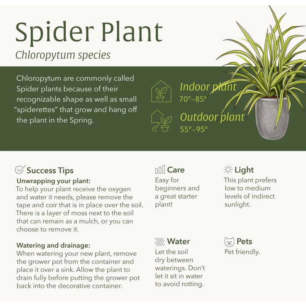 Our spider plants bring the lush jungles of Southern Africa to your home. One of the best air purifying plants, we love them for their spiky variegated foliage. They are easy to care for and look great set on a table-top or hung from a macrame sling. You can even keep them out on the patio during summer – just remember to bring them inside if there’s any risk of frost. Our spiky and spectacular Spider plant (Chlorophytum Comosum) will also bring instant attitude to any room in your home. With lime green and yellow variegated leaves, this house plant is bright and beautiful. They are an excellent air purifier and are super easy to care for.