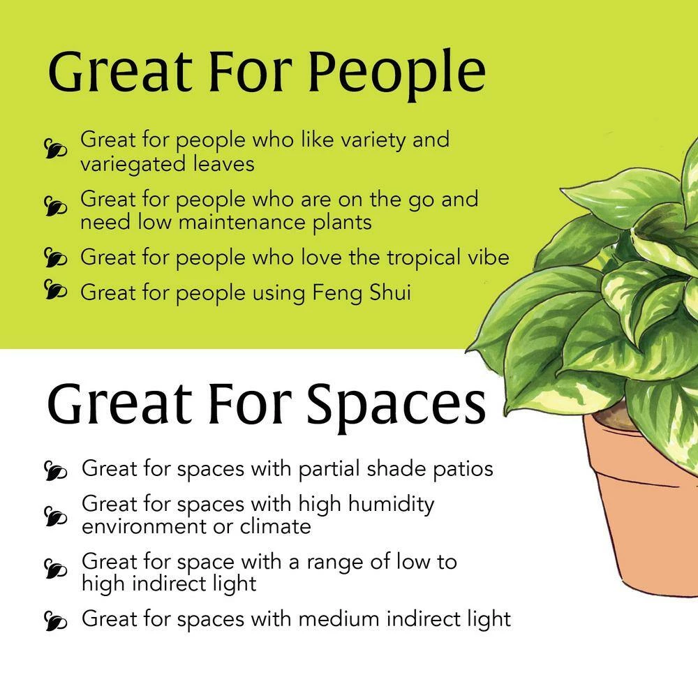 - CARE LEVEL: This plant loves low to medium indirect light. Allow the soil to dry out completely between waterings. Pothos love high levels of humidity. Spritz occasionally.