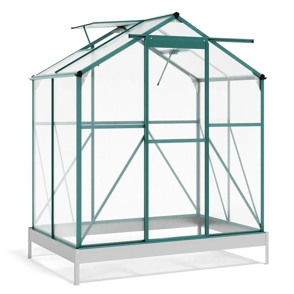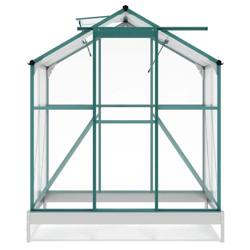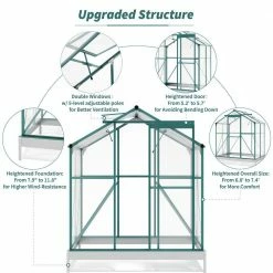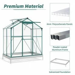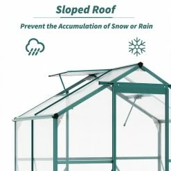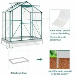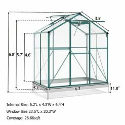 This greenhouse is made from coated aluminum and 4 mm double transparent polycarbonate panels with a removable protective film that maintains weather resistance and light transmission as well as maximum insulation and can protect your flowers or herbs from rain and snow. This greenhouse is designed to have 2 Windows with 5 level adjustable rods, which will improve air circulation and thus better ventilation. A pitched roof will help improve wind resistance and also prevent accumulation of snow or rain to extend life.