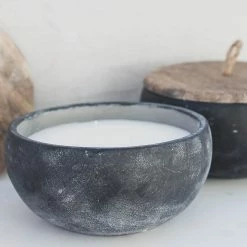 - Materials: cement vessel, wooden lid, rope handle, wax candle