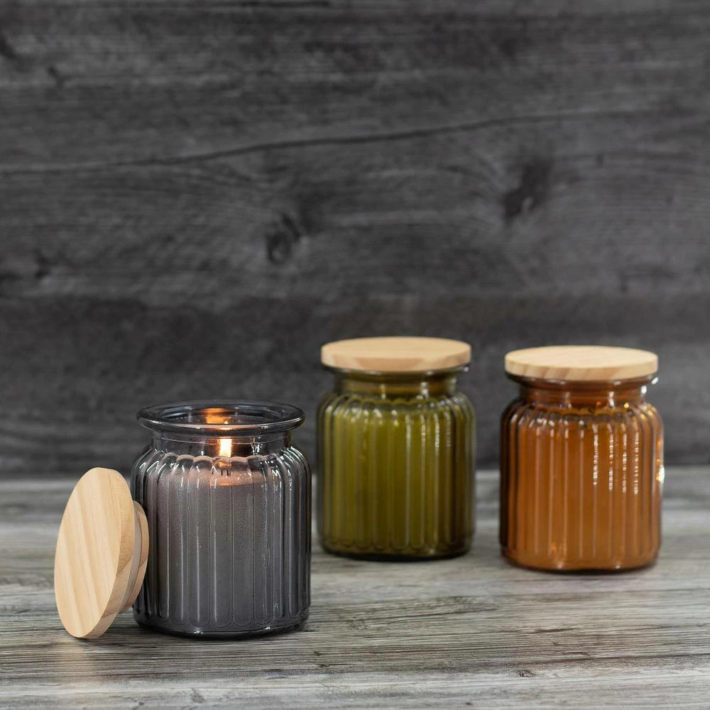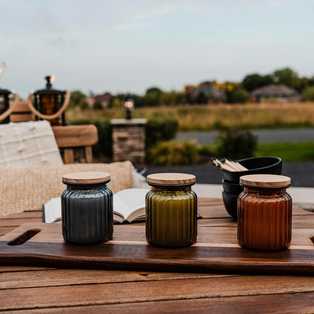 “Our Blake Heirloom Citronella Candle pairs a simple retro shape with a natural finish wooden lid to create a unique modern look that is a little bit modern and a little bit vintage. These small citronella candles have a classic rigged texture in a fluted vessel and come in our vintage collection colors of amber, wine-bottle green, and charcoal grey (each 3-pack comes with one candle in each color). You’ll love the way the flame glows through the tinted glass of these outdoor citronella candles to warm up your patio space. Pair our Patio Essentials 7.5-ounce glass citronella candle with wooden lid, 3-Pack with any of our other Blake Vintage Collection items to add more of these warm, neutral glass colors to your patio, and space them 18-36 inches apart around the perimeter of your outdoor space for maximum coverage.”