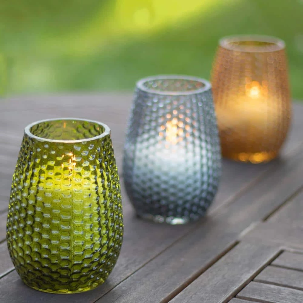 “Our Blake Dotted Citronella Candle combines sleek lines, vintage-inspired colors, and textured dot detailing for a fun, yet sophisticated look. Each 3-pack comes with one candle in amber, wine-bottle green, and charcoal grey. The wax of the candles sits low within the glass to help protect the flame from wind outdoors, so go ahead and line them up on your patio table to enjoy a cozy night outdoors with a warm, inviting glow! Pair this Patio Essentials 9-ounce Dotted Glass Citronella Candle, 3-Pack with any of our other Blake Vintage Collection items to add more of these warm, neutral glass colors to your patio, and space them 18-36 inches apart around the perimeter of your outdoor space for maximum coverage.”