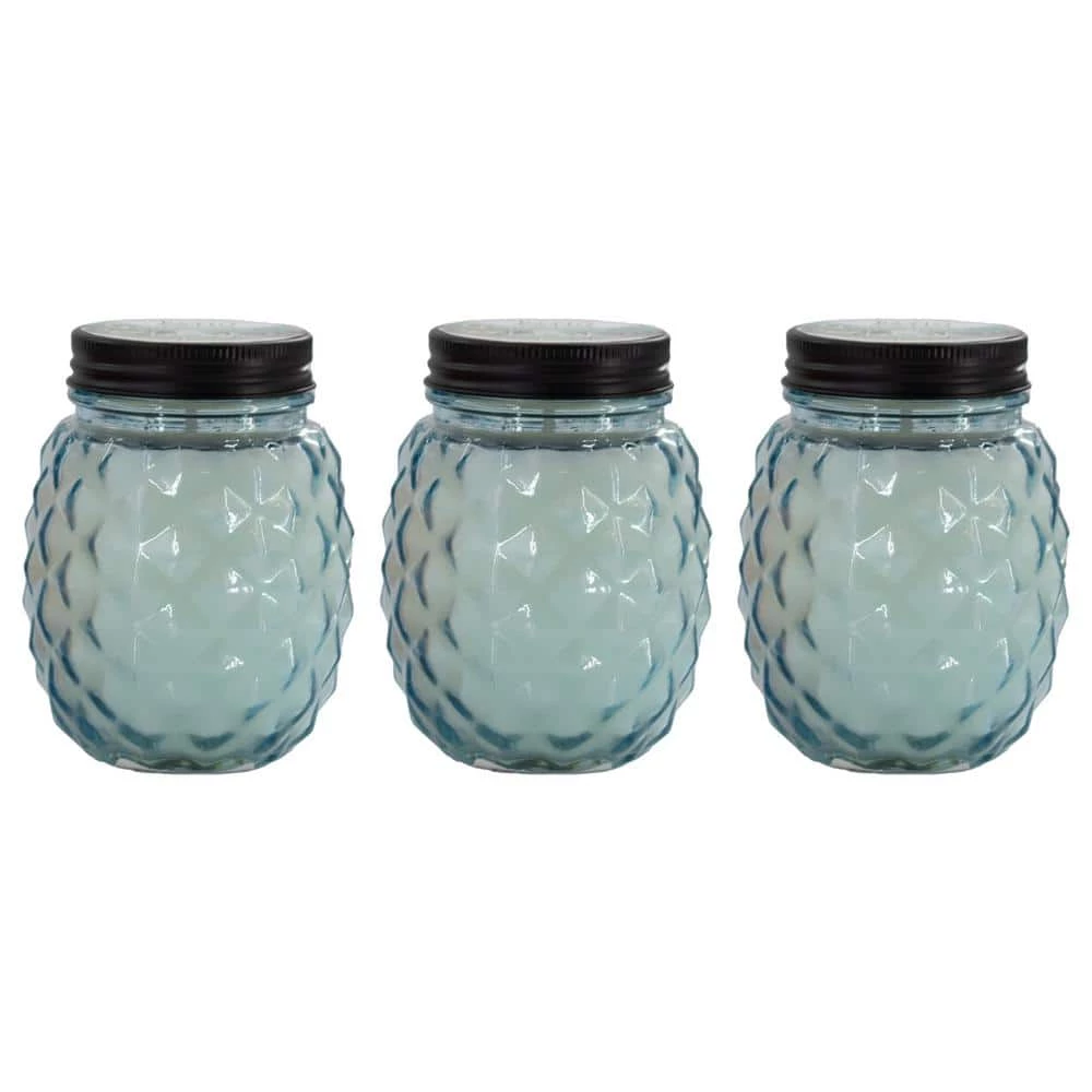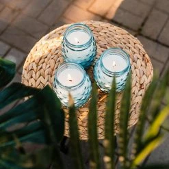 “Add a fun, tropical touch to your outdoor space with our Leilani Lemongrass and Citronella Candles! These medium-sized outdoor candles come in textured glass containers inspired by a pineapple with a playful semi-opaque blue, green, or pink tint that adds some subtle tropical color to your outdoor living space. Each 3-pack comes with three candles in each color, so pick your favorite or add a few to your cart to mix and match! These citronella and lemongrass candles aren’t just a fun way to add a tropical vibe to your patio space but have functional features that you’ll love too. The combination of 3% citronella and 3% lemongrass oils helps keep mosquitoes away so you can enjoy being outside! In testing, these candles helped reduce mosquito landings by up to 60% when 4 candles were spaced 18-36 inches apart around the perimeter of the seating space. The included metal lid will also help protect the candle from the elements when not in use! Run with an island theme and pair this Patio Essentials 22 oz. Glass Citronella and Lemongrass Candle, 3-Pack with any of the other citronella candles and torches in our Tropical Collection and space them 18-36 inches apart around the perimeter of your outdoor space for maximum coverage.”