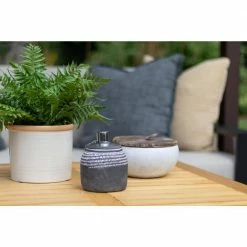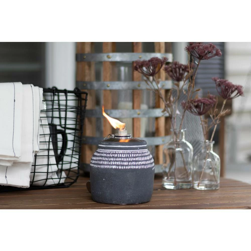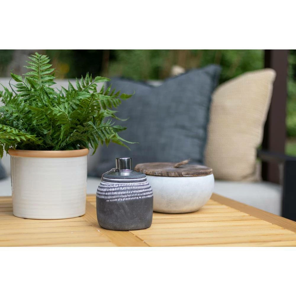 Add an artistic touch to your outdoor living space with our Dakota Abstract Tabletop Torches. The soft grey faux-stone finish and white abstract detailing around the top of the tabletop tiki torch exude an old-world sophistication and handmade charm that will complement any decor style. Whether you add these tabletop tiki torches to your patio dining table as a centerpiece or use them to brighten up your front porch, you’ll love that they’re an effortlessly chic way to level up your outdoor space. Pair our Patio Essentials Abstract Stone Tabletop Torch, 2-Pack with any of our other citronella candles and torches, then space them 18-36 inches apart around the perimeter of your outdoor space for maximum coverage.