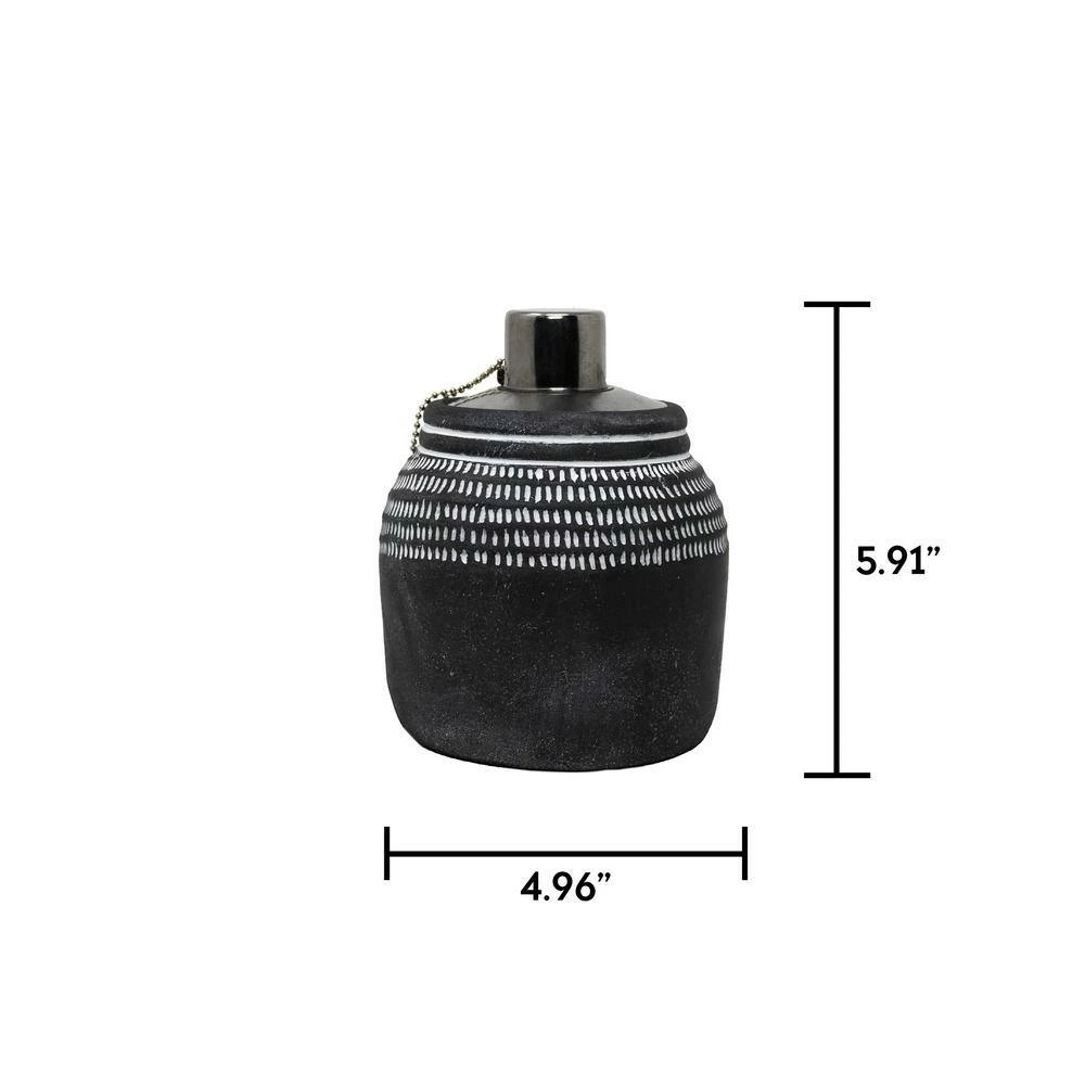 - Materials: stone torch body, metal fuel canister and metal snuffer, fiberglass wick