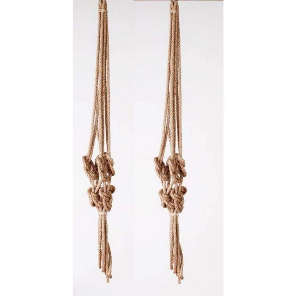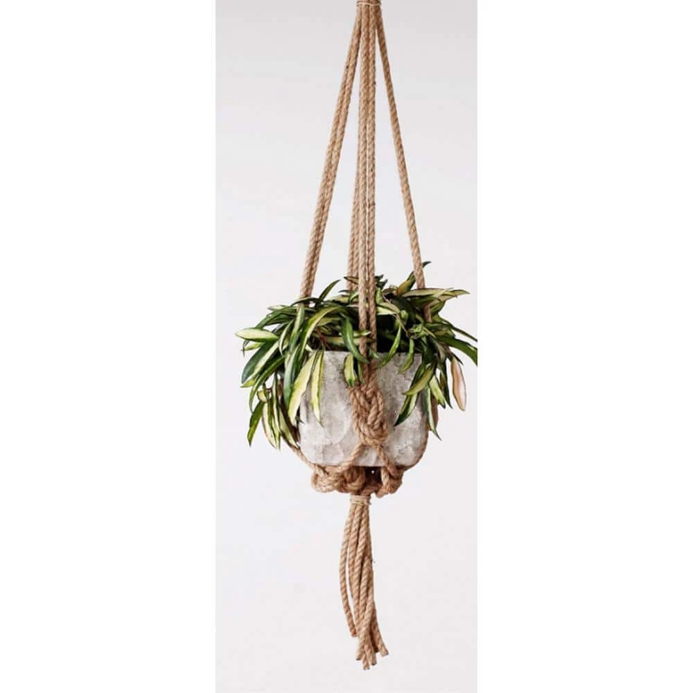Primitive Planters Indoor/Outdoor Jute Knotted Rope Hanger looks great with vases, glassware, bowls, gazing balls, etc. Natural Jute color matches with any color pot, pottery, flower hanging basket, plants and flowers. The silver metal O-Ring at the top attaches to hooks or bracket.