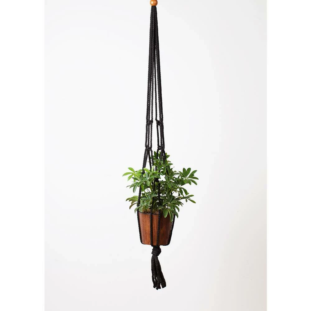 Primitive Planters Bagged Black Macrame is a 36 in. Black Polypropylene macrame Hanger that also includes a bonus ceiling hook. Great gift idea. This plant hanger hold pots 7 in. to 12 in. size. Indoor/Outdoor use. There is a ring at the top for easy hanging and a wooden decorative bead at the top. Plants and pots not included.