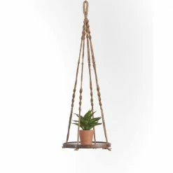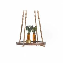 Primitive Planters 36 in. Wooden Shelf Hanger – Jute is a 12 in. round gorgeous stained Mango wood tray table with a 1/4 in. lip at the top. 4 sided hanger helps in keeping secure when hanging. Use in any room in home/office. Use as a nightstand or coffee table or to display your favorite items. Pair up with a Primitive Planters S-Hook for easy hanging. (plants, pots and accessories not included).