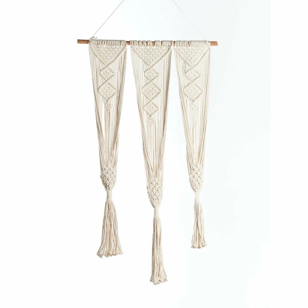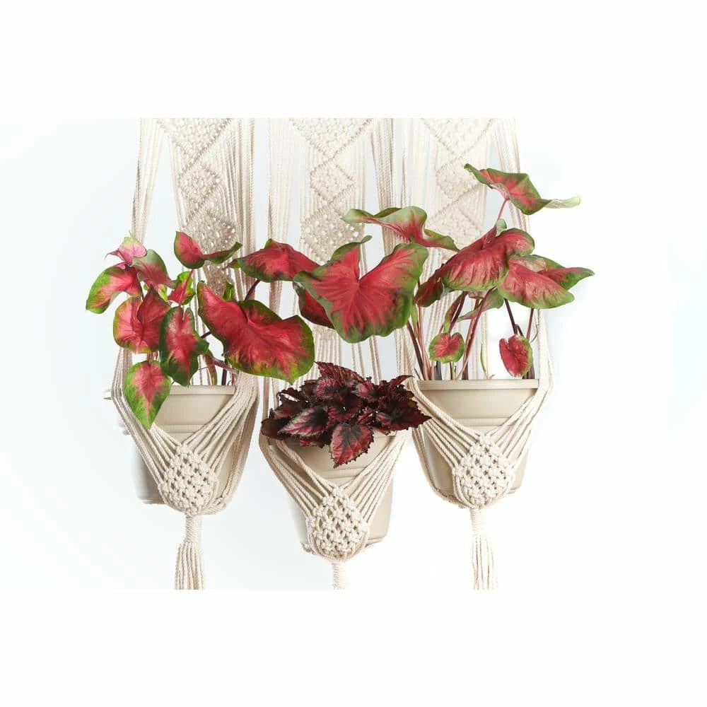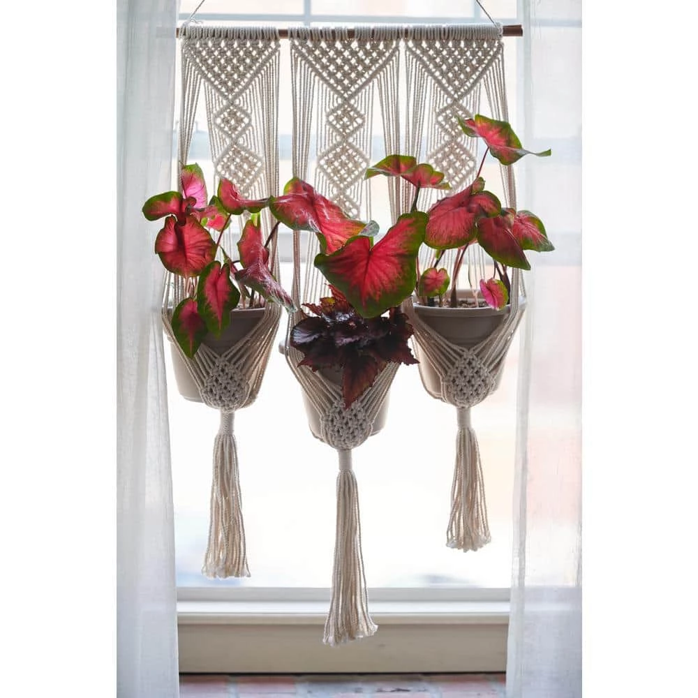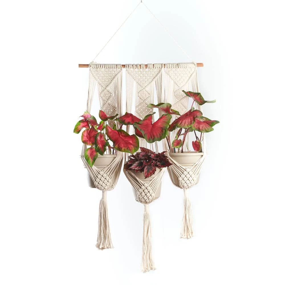 Primitive Planters Triple Pot Wall Hanger is made from 100% woven cotton. This unique plant hanger holds 3 pots up to 8 in. Dia. There is a cord at the top that you can use to hang against a wall or hang off a ceiling hook or wall bracket. Use with Primitive Planters S-Hook for easy hanging. Gorgeous detail on this triple plant hanger. (pots and plants not included).