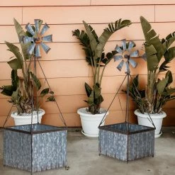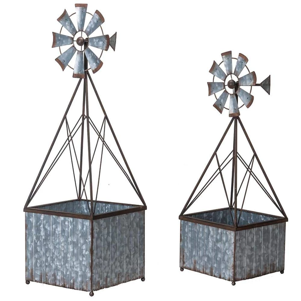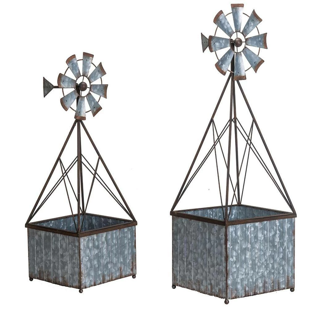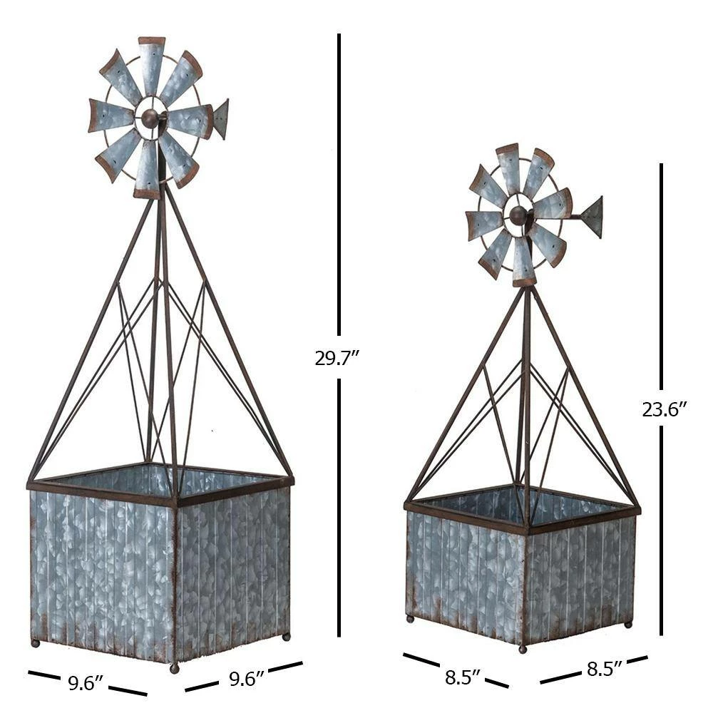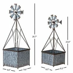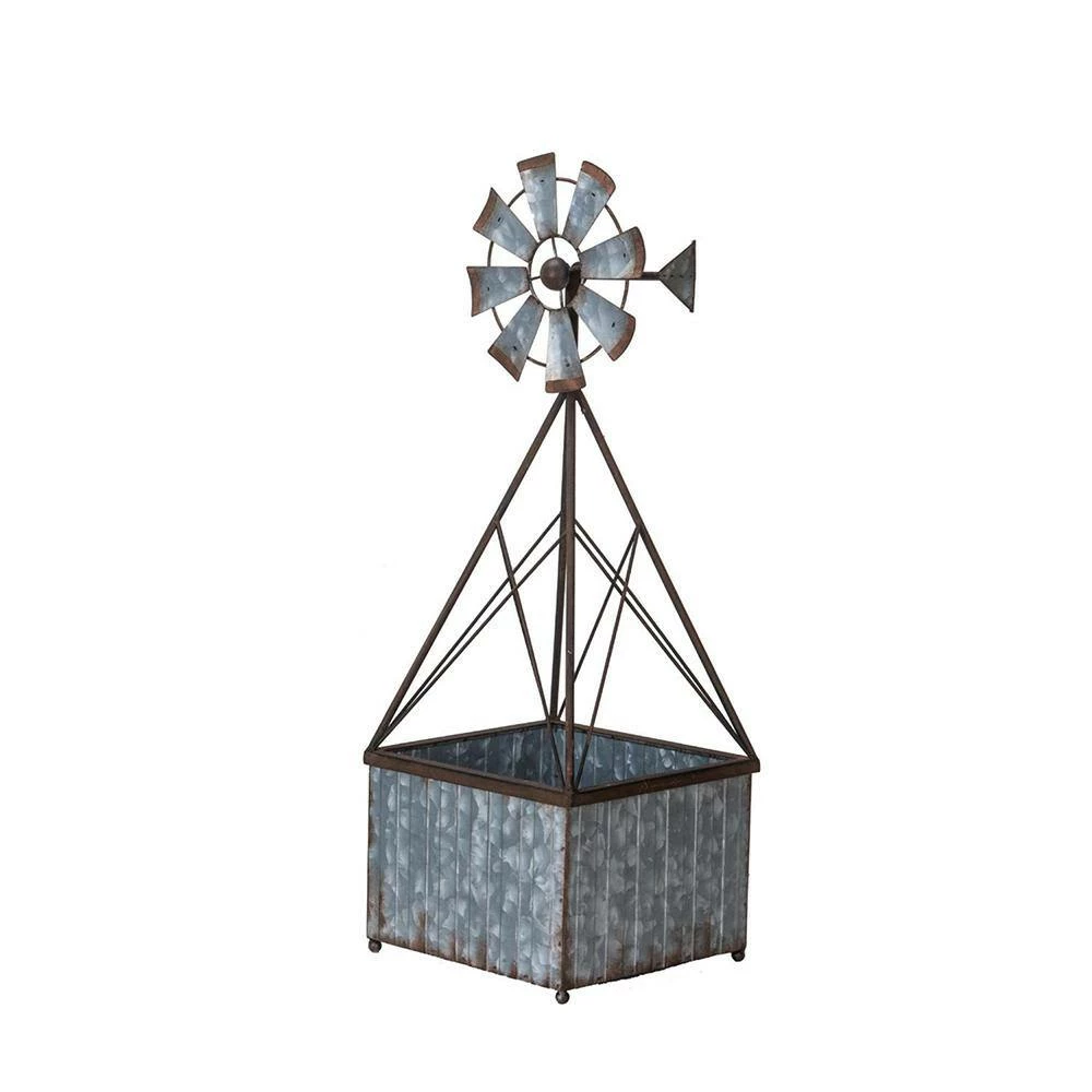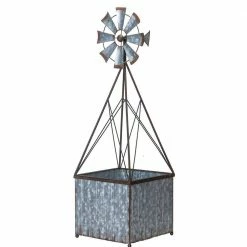 This metal windmill-inspired planter brings tranquility to your space by allowing you to fill it with plants-hence it promotes wellness and creates an immediate feeling of relaxation. This decorative planter is sure to add bundles of charm to your home. Beautifully detailed, it features gray square planter box, silver mini wheel, and brown pyramidal frame. This windmill planter is made out of iron with solid construction, offering durability. Jazz up farmhouse themed spaces using this charming accent piece that is ideal for outdoor use. A perfect complement to any outdoor area with a farmhouse design. Designed with black rubber stoppers at the base that prevent scratching furniture and table tops, as well as sliding around. Wipe clean with a dry cloth. This planter is designed with a windmill structure. Suitable for indoor and outdoor use. Farmhouse-themed style. This item comes shipped in 1 carton.