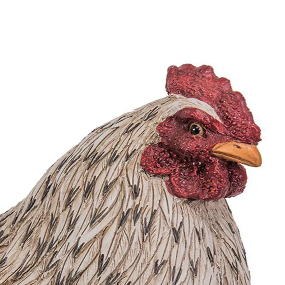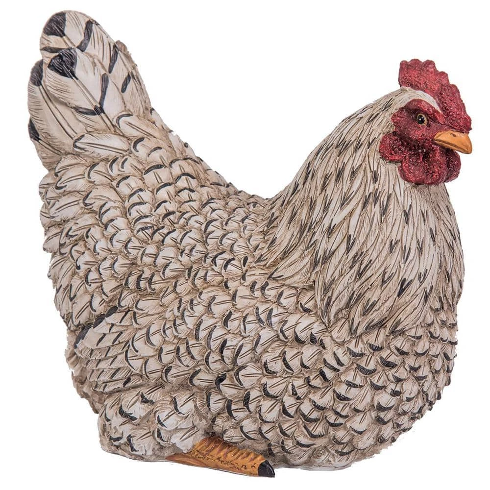 Let your imagination run wild as you wander around a vast field full of colorful flowers and sing along to the tune of birds chirping at the background as a flock of chickens roam free, eat berries, and enjoy the shimmering sunlight. Intricately crafted to perfection. This stone-like garden decor features a country cottage-inspired sculpture of a sitting chicken with bronze colored feet and carved facial details.