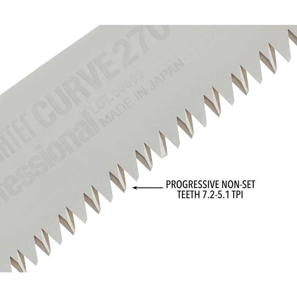 Replacement Blade Only for Silky Gunfighter Curve Professional Progressive Saw 270mm/10.6 in. The highest grade of premium Japanese steel available on any Silky product. Progressive teeth (6 to 8.5 teeth/30 mm, 5.1 to 7.2 teeth per inch) are finer near the handle and get progressively larger allowing for smooth starts and productive finish of each stroke. Electroless Nickel Plating (ENP) provides more wear and rust resistance leading to greater longevity.