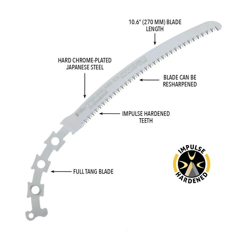 Replace your old, dull saw blade with this reliable Silky 455-27 TSURUGI 11 in. Curved Large Teeth Hand Saw Replacement Blade. Featuring premium, durable steel and a unique 11 in. curved blade design, this hand saw delivers long-lasting and precise cutting power. The excellently-designed construction features super slender ‘spine of teeth’ with 6.4 teeth per inch which helps with difficult pruning and gardening tasks, even in tight spaces.
