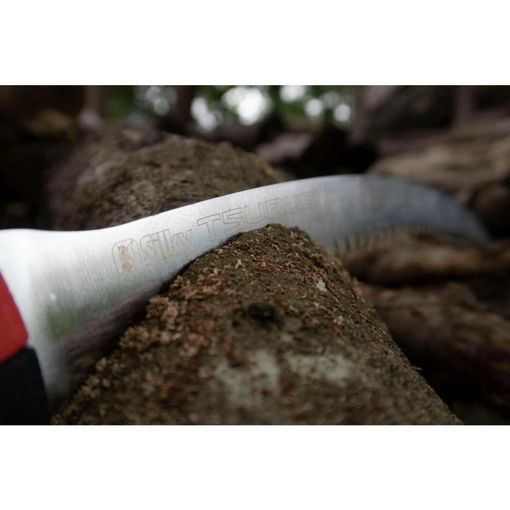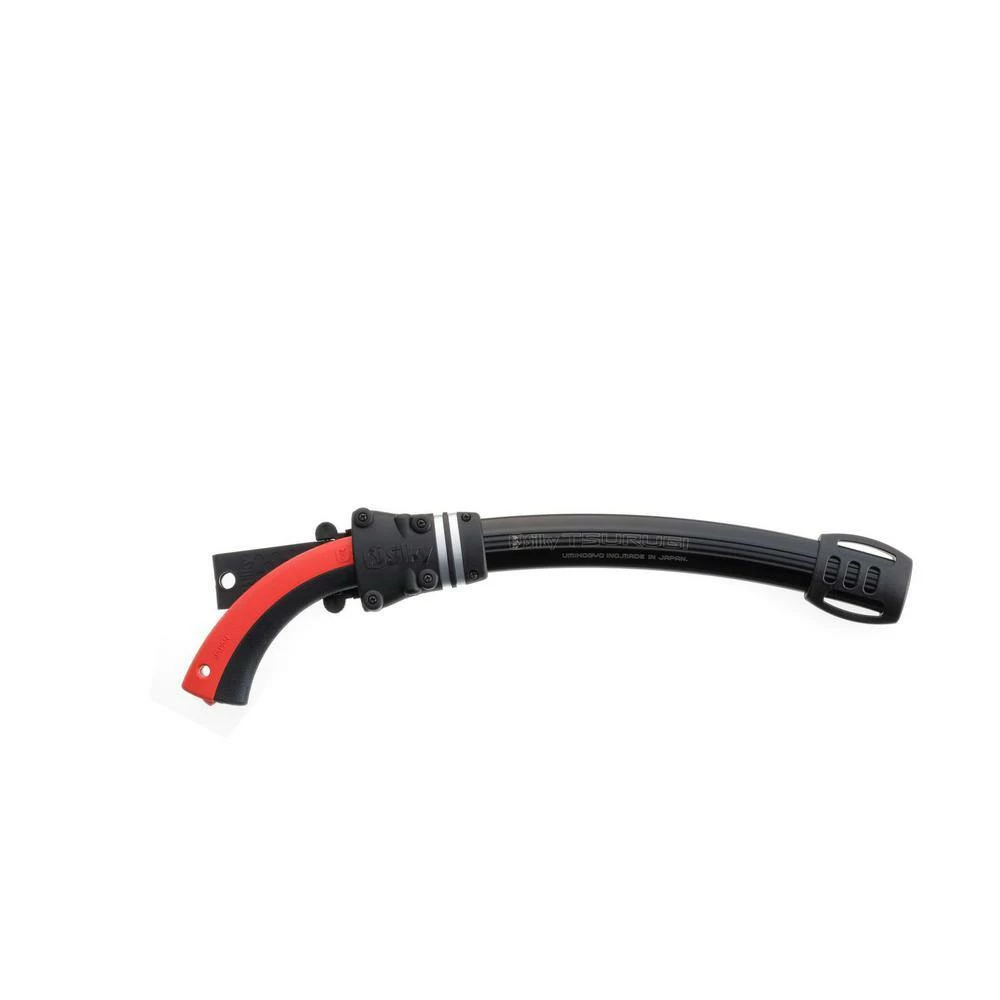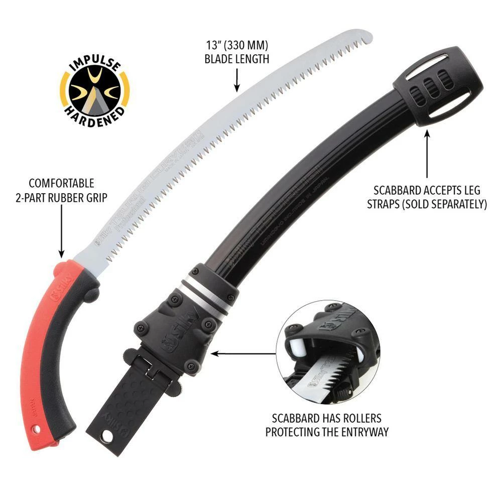 The Silky 454-33 TSURUGI 13 in. Curved Large Teeth Hand Saw offers an aggressive blade in popular sizes and provides a lightweight design without the need for handle screws, nuts or inessential hardware. The comfortable, 2-part rubber grip is held together by a creative combination with the full tang blade. The Silky TSURUGI Curved Hand Saw comes in a unique aluminum scabbard that can be attached to the belt or leg depending on your preference and has eight rollers protecting the entryway.