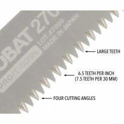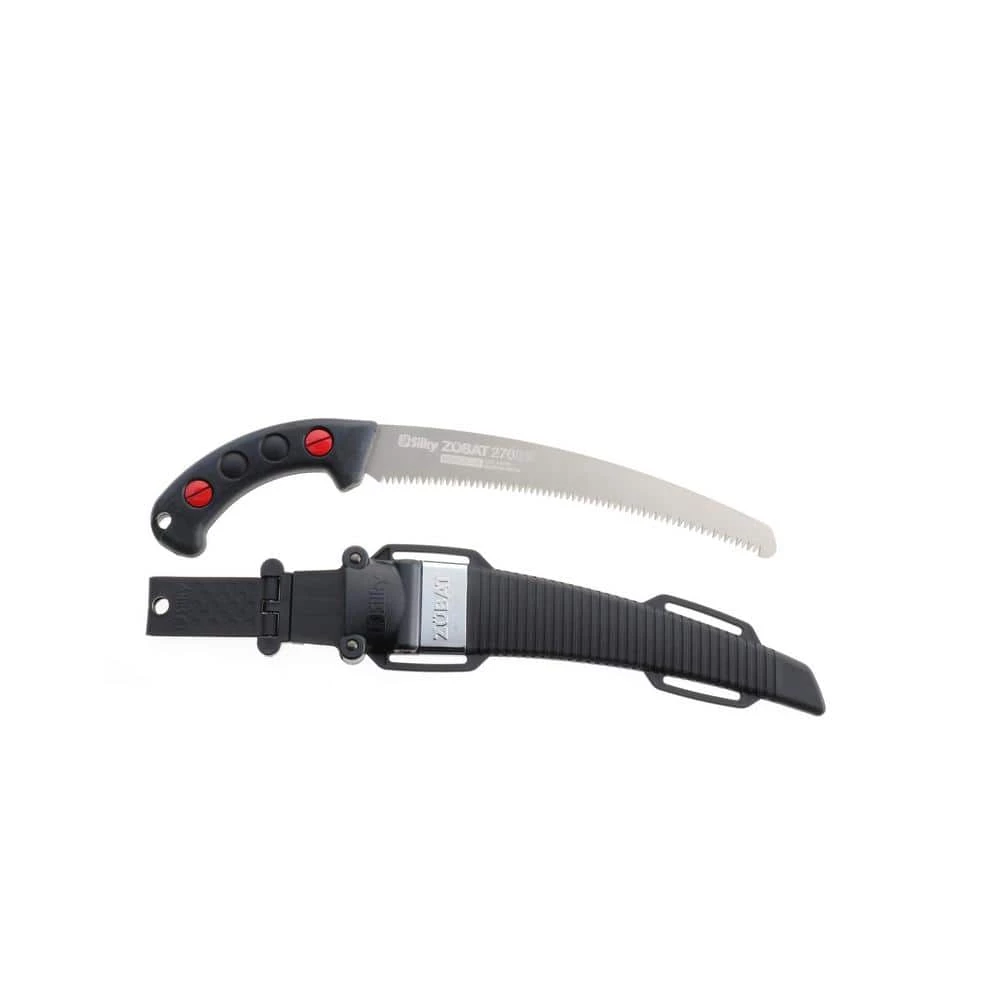 The Silky ZUBAT 11 in. Hand Saw offers a great combination of a high performance curved blade with an exceptional design and a superior finish quality. Ideal for all pruning tasks and cutting large branches, these heavy-duty hand saws feature a curved, rust-resistant mono-constructed blade which provides greater cutting speed with less effort. Each taper-ground blade has an impulse-hardened, non-set tooth design. Utilizing proprietary Silky MIRAI-ME Smooth Cutting Technology, four cutting angles provide fast, clean and extremely smooth cutting action. The hard chrome-plated blade has 6.5 teeth per inch, resists rust and effects of tree resin and wipes clean easily. A molded-rubber handle houses the fast-cutting curved blade securely inside a custom-fitted, pivoting, black polypropylene sheath with detachable belt holder.