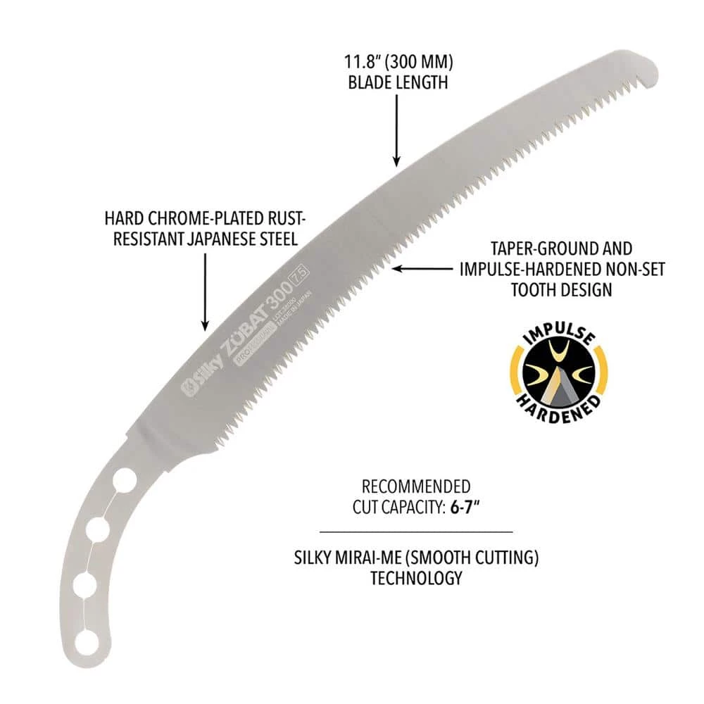 Replace your old, dull saw blade with this reliable Silky 271-30 ZUBAT 12 in. Hand Saw Replacement Blade which offers the perfect blend of a high-performance curved blade with an exceptional design and a superior finish quality. Ideal for all pruning tasks and cutting large branches, these heavy-duty hand saws feature a curved, rust-resistant mono-constructed blade which provides greater cutting speed with less effort. Each taper-ground blade has an impulse-hardened, non-set tooth design. Utilizing proprietary Silky MIRAI-ME Smooth Cutting Technology, four cutting angles provide fast, clean and extremely smooth cutting action. The hard chrome-plated blade has 6.5 teeth per inch, resists rust and the effects of tree resin and wipes clean easily.