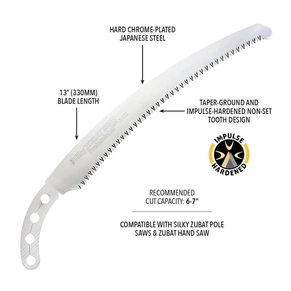 Replace your old, dull saw blade with the Silky 271-33 ZUBAT 13 in. Large Teeth Hand Saw Replacement Blade which offers a great combination of a high performance curved blade with an exceptional design and a superior finish quality. Ideal for all pruning tasks and cutting large branches, these heavy-duty hand saws feature a curved, rust-resistant mono-constructed blade which provides greater cutting speed with less effort. Each taper-ground blade has an impulse-hardened, non-set tooth design. Utilizing proprietary Silky MIRAI-ME Smooth Cutting Technology, four cutting angles provide fast, clean and extremely smooth cutting action. The hard chrome-plated blade has 6.5 teeth per inch, resists rust and effects of tree resin and wipes clean easily.