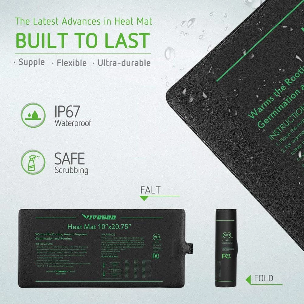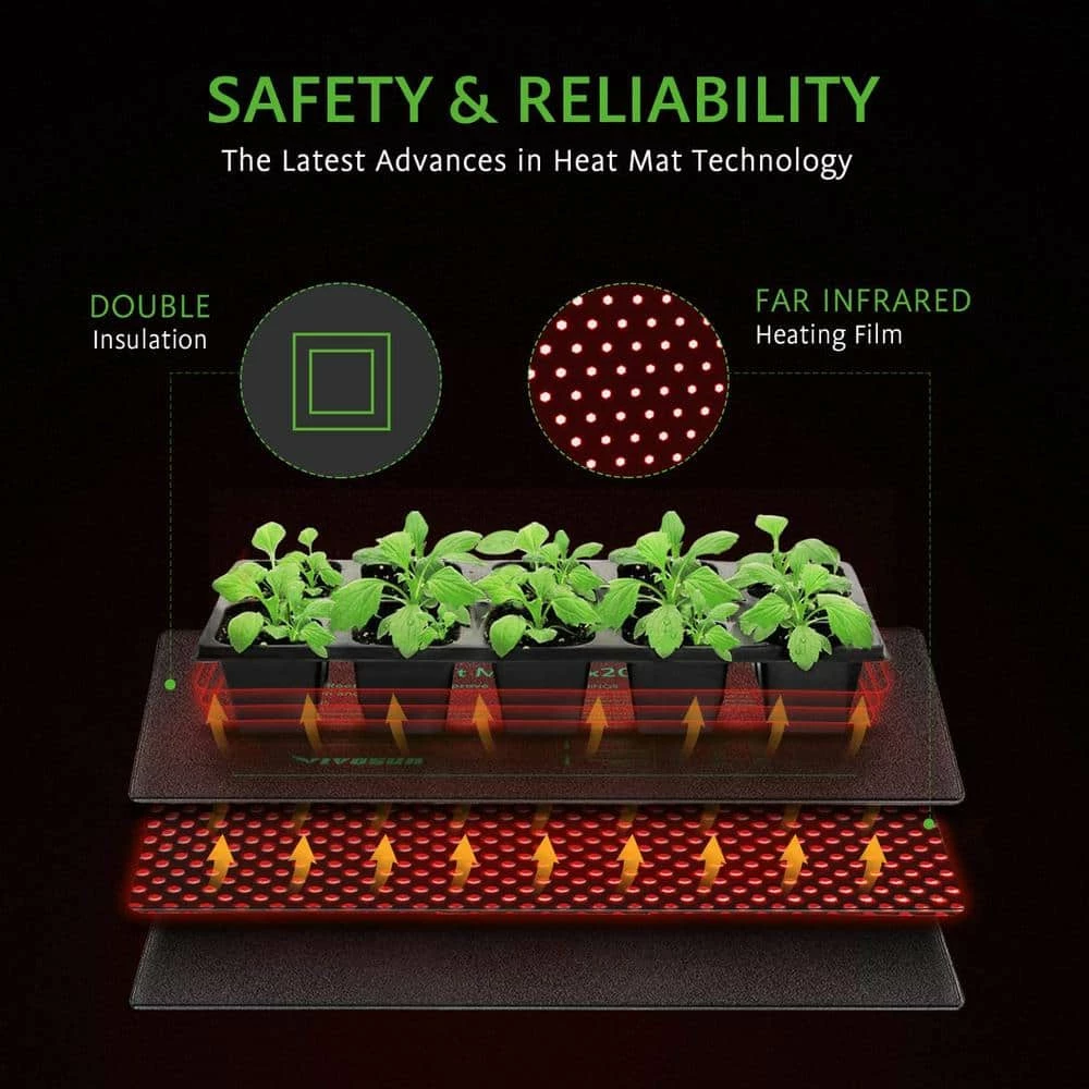 VIVOSUN’s heat-mat technology hits that sweet spot temperature around 20°C-30°C (68°F-86°F) – perfect for seed starting and cutting propagation. After covering with a humidity dome, the mat gets warm enough to create dew throughout the plastic dome, keeping your plants from drying out. Keeps a steady temperature and distributes heat evenly, even in the cold (with an insulating layer underneath).