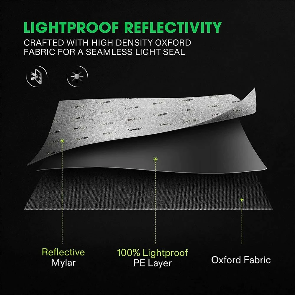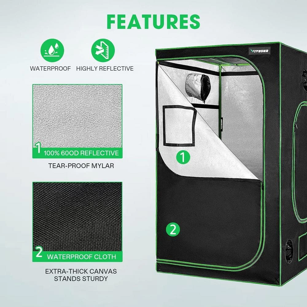 VIVOSUN grow tent features extra-thick 600D canvas with metal poles and corner adapters to make it stable and durable. Unique diamond reflective mylar design provides 98% grow light reflection and creates a superior indoor growing environment. Offers plenty of venting that can be easily opened or closed or used in conjunction with cables, ducting and fans. The light green metal poles lock in place, with no hardware or complicated installation needed.