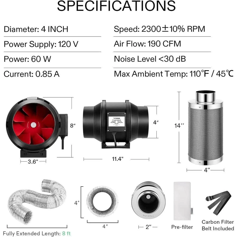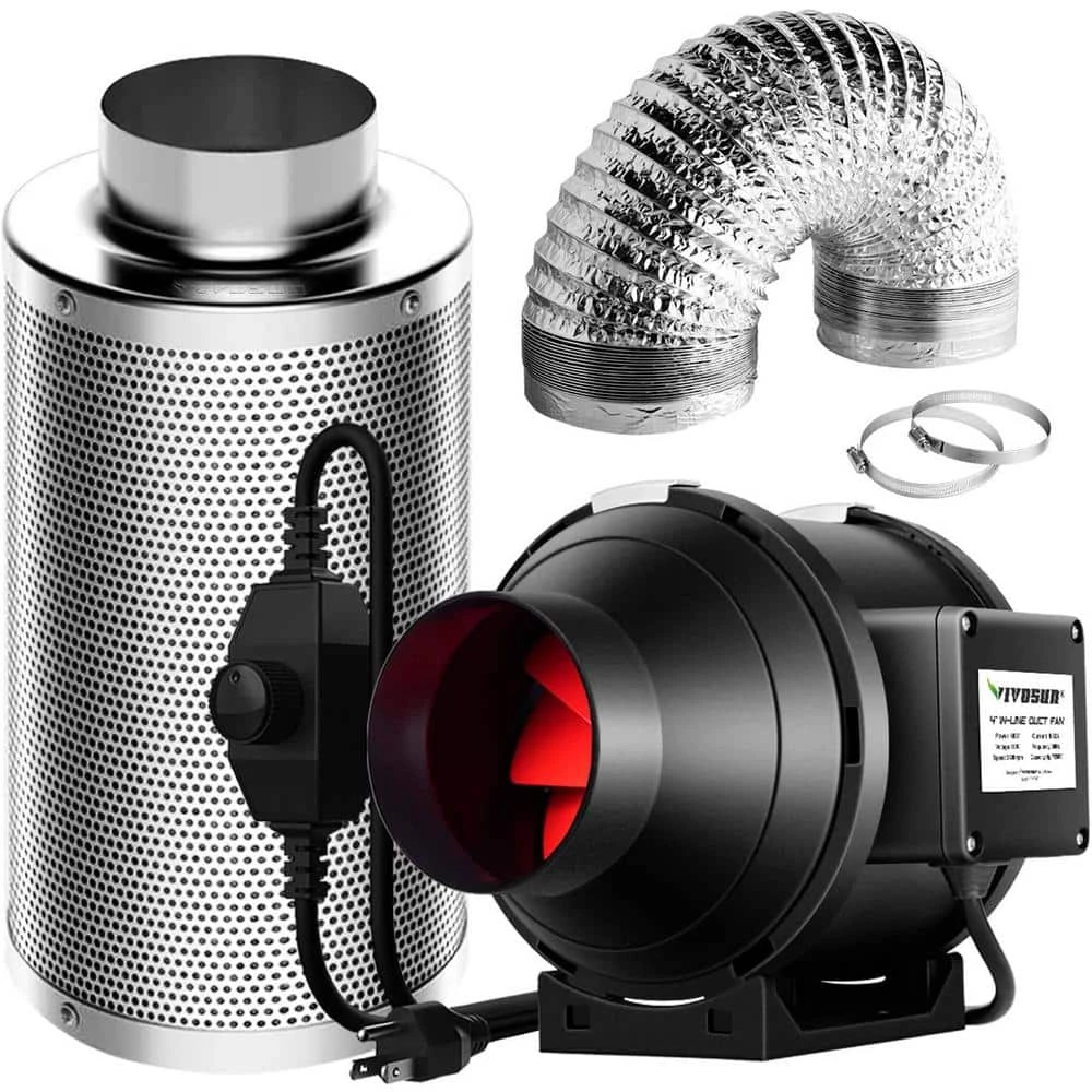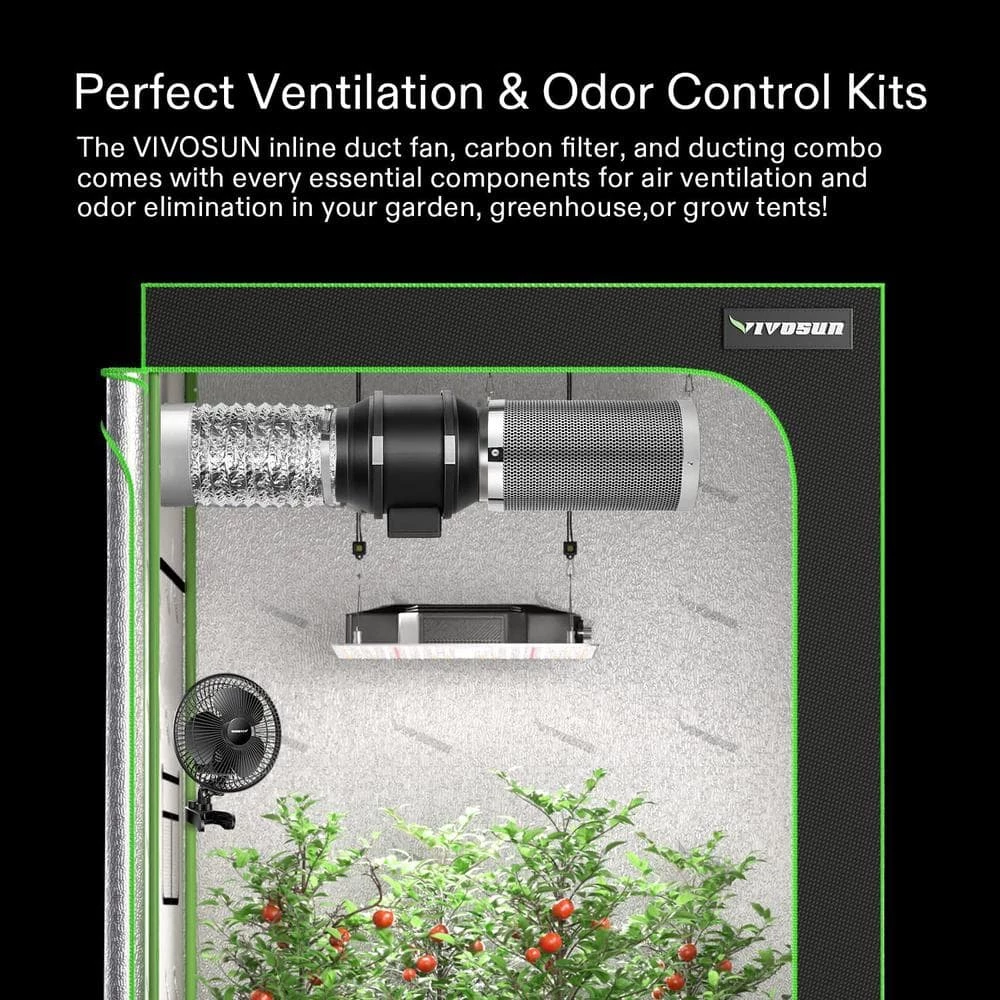 The VIVOSUN ventilation kit includes a 4 in. 190 CFM inline duct fan, a 4 in. carbon filter and a 8 ft. of ducting. This combo is primarily used in various air circulation and ventilation projects to move and transport air. The inline duct fan is compact and lightweight enough to be installed in areas with little available space. Widely used in HVAC applications, bathroom venting, stove exhaust, dryer ventilation, kitchen cooking exhaust, planting room, or greenhouse air circulation, etc.; Also used to cool AV equipment rooms, closets, racks, and cabinets.